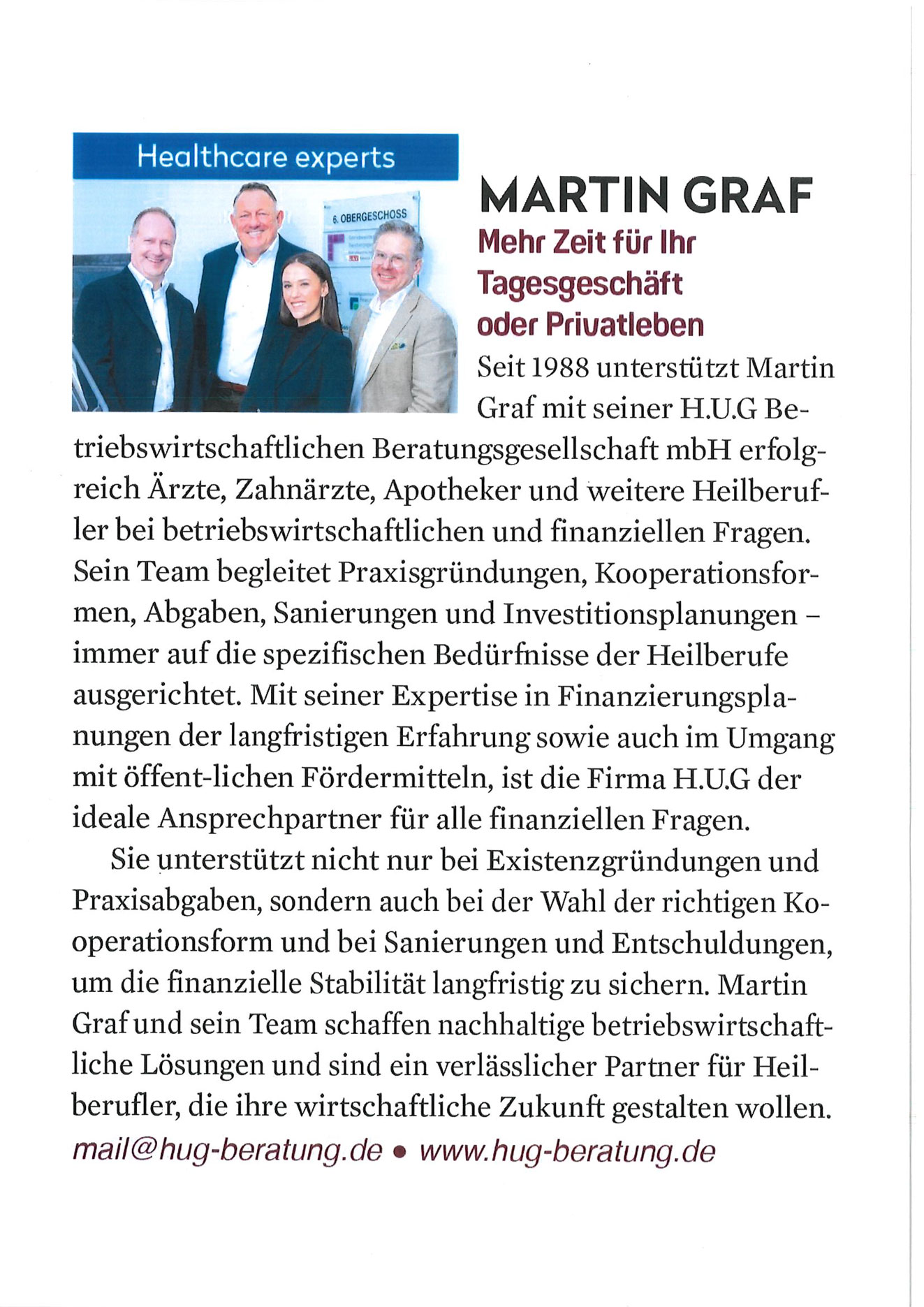 Seit 1988 unterstützt Martin Graf H.U.G. mit seiner Betriebswirtschaftlichen Beratungsgesellschaft mbH erfolgreich Ärzte, Zahnärzte, Apotheker und weitere Heilberufler bei betriebswirtschaftlichen und finanziellen Fragen. Sein Team begleitet Praxisgründungen, Kooperationsformen, Abgaben, Sanierungen und Investitionsplanungen, immer auf die spezifischen Bedürfnisse der Heilberufe ausgerichtet. Mit seiner Expertise in Finanzierungsplanungen, der langfristigen Erfahrung sowie auch im Umgang mit öffentlichen Fördermitteln ist die Firma H.U.G. der ideale Ansprechpartner für alle finanziellen Fragen.